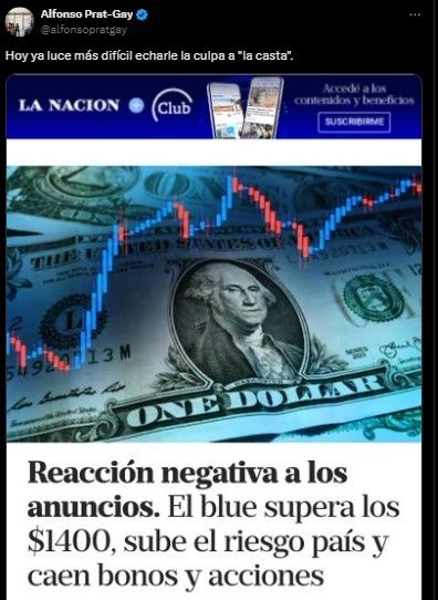 En ese sentido, el exfuncionario de Mauricio Macri compartió el título de una nota que decía: "Reacción negativa a los anuncios. El blue supera los $1400, sube el riesgo país y caen bonos ya acciones".