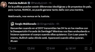 "Recuerdan cuando en el 2017 transmitían las 24 hs en los medios con la Desaparición Forzada de Santiago? Mientras nos iban endeudando e hicieron aparecer el cuerpo cuando ellos quisieron. Con Loan pasa lo mismo, Bullrich sabe dónde está. Aparecerá cuando ellos quieran. #Loan", escribió en la red social X.