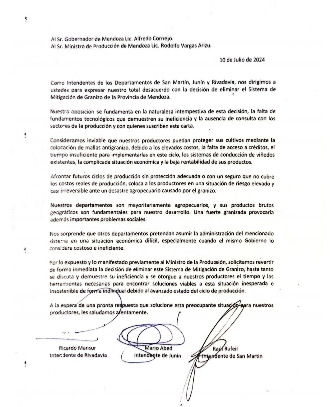 "Solicitamos revertir de morcha inmediata la decisión de eliminar el sistema de mitigación de granizo hasta tanto se discuta y se demuestre su ineficiencia", expresaron en la nota.