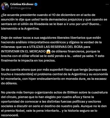 La exvicepresidenta Cristina Fernández de Kirchner cuestionó al presidente Javier Milei, tras su anuncio desde Estados Unidos respecto a modificaciones en las operaciones cambiarias y lo de usar reservas del Banco Central para frenar la suba del dólar.