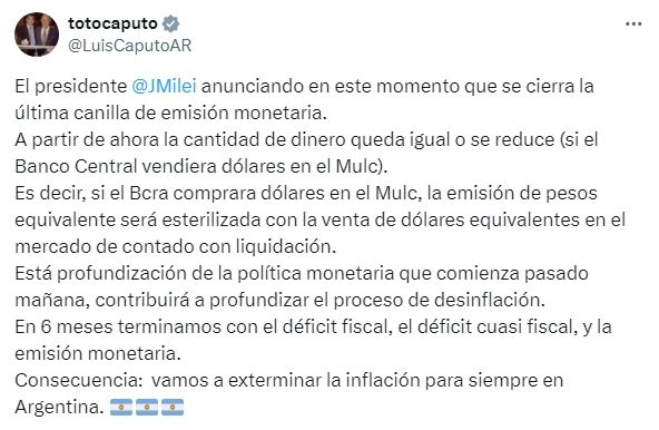 El ministro de Economía, Luis Caputo, tomó lo expresado por Milei y lo explicó en su cuenta de X. "El presidente @JMilei anunciando en este momento que se cierra la última canilla de emisión monetaria. A partir de ahora la cantidad de dinero queda igual o se reduce (si el Banco Central vendiera dólares en el Mulc). Es decir, si el Bcra comprara dólares en el Mulc, la emisión de pesos equivalente será esterilizada con la venta de dólares equivalentes en el mercado de contado con liquidación"