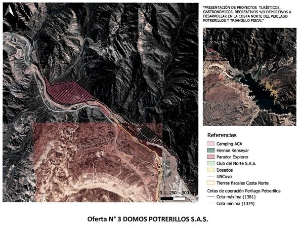 La propuesta de Domos Potrerillos SAS consiste en un desarrollo gastronómico de montaña, escalable a tres restoranes. El área total comprendida en el proyecto es de aproximadamente 6 hectáreas, ubicadas dentro del departamento de Las Heras, en la zona noroeste del perilago.