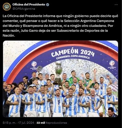 "La Oficina del Presidente informa que ningún gobierno puede decirle qué comentar, qué pensar o qué hacer a la Selección Argentina Campeona del Mundo y Bicampeona de América, ni a ningún otro ciudadano. Por esta razón, Julio Garro deja de ser Subsecretario de Deportes de la Nación", señaló la Oficina del Presidente.