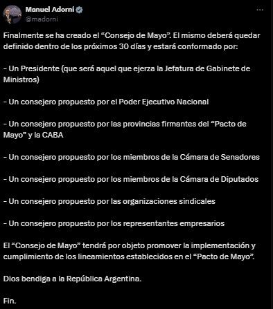 "El ´Consejo de Mayo´ tendrá por objeto promover la implementación y cumplimiento de los lineamientos establecidos en el ´Pacto de Mayo´. Dios bendiga a la República Argentina", completó su mensaje Adorni.