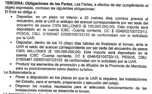A su vez, la UAR asumió las obligaciones de constituir garantía. “La UAR deberá constituir un fiador solidario y/o principal pagador; en su defecto podrá librar un pagaré a la vista y sin protesto o contratar un seguro de caución por el total de la suma comprometida”, indicó el convenio.