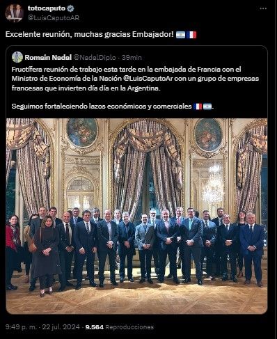 El diplomático compartió una foto del encuentro en su cuenta de red social X, donde calificó la reunión de "fructífera". El embajador indicó también que participaron un grupo de empresas francesas que "invierten día día en la Argentina".