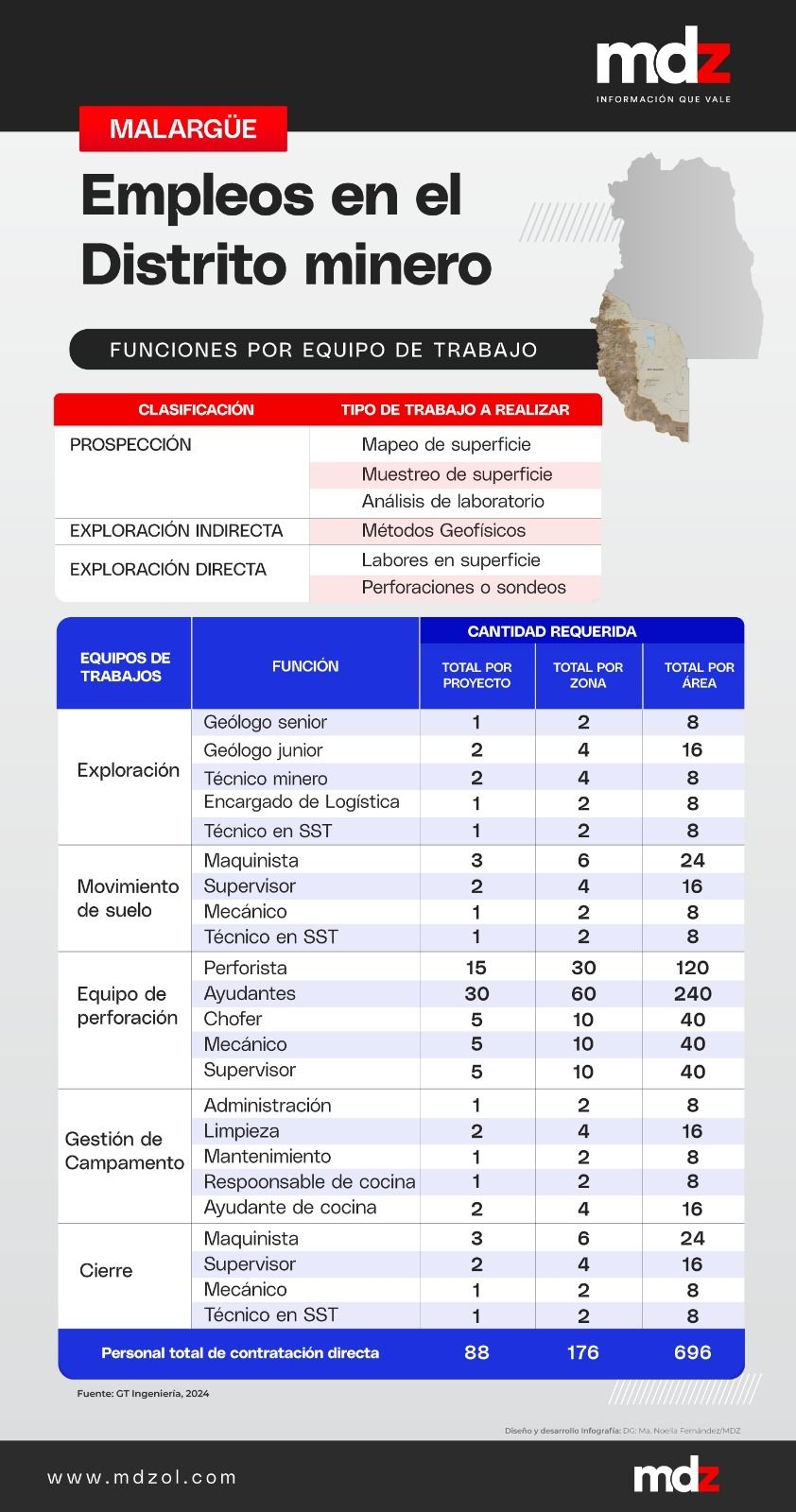 El plan proyecta trabajos por dos años. En ese período se plantean tres etapas: prospección, exploración indirecta y exploración directa. La demanda de empleo es escalonada. En la prospección, por ejemplo, se realizan relevamientos superficiales, con baja demanda e impacto. Luego se realizan trabajos de exploración indirecta, con el uso de tecnología. La exploración directa sí tiene tareas más intensivas sobre el terreno. En esa etapa comienza la demanda más diversificada de trabajo. En el pico máximo de exploración, cada proyecto prevé generar 88 puestos de trabajo directos, con un factor multiplicador mayor por la logística. En el plan se tiene en cuenta que podría haber hasta 8 proyectos en simultáneo, en el mejor de los casos. Solo se presenta un calculo matemático, pero el impacto real dependerá de cada proyecto.