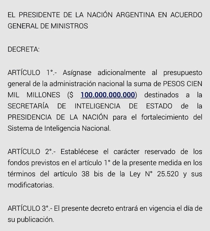 El articulo 2 del decreto marca que se "establece el carácter reservado de los fondos previstos en el artículo 1° de la presente medida en los términos del artículo 38 bis de la Ley N° 25.520 y sus modificatorias".