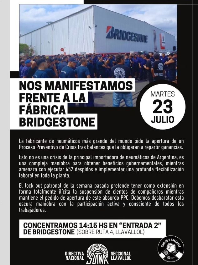 La multinacional del neumático Bridgestone solicitó la apertura del procedimiento preventivo de crisis y paralizó su planta de la localidad bonaerense de Llavallol. Hoy los trabajadores del Sindicato Único de Trabajadores del Neumático Argentino (SUTNA) paran y marchan hasta esa sucursal en contra de la compañía que despidió a 452 trabajadores, disminuyó los salarios y flexibilizó las condiciones laborales, según señalaron.