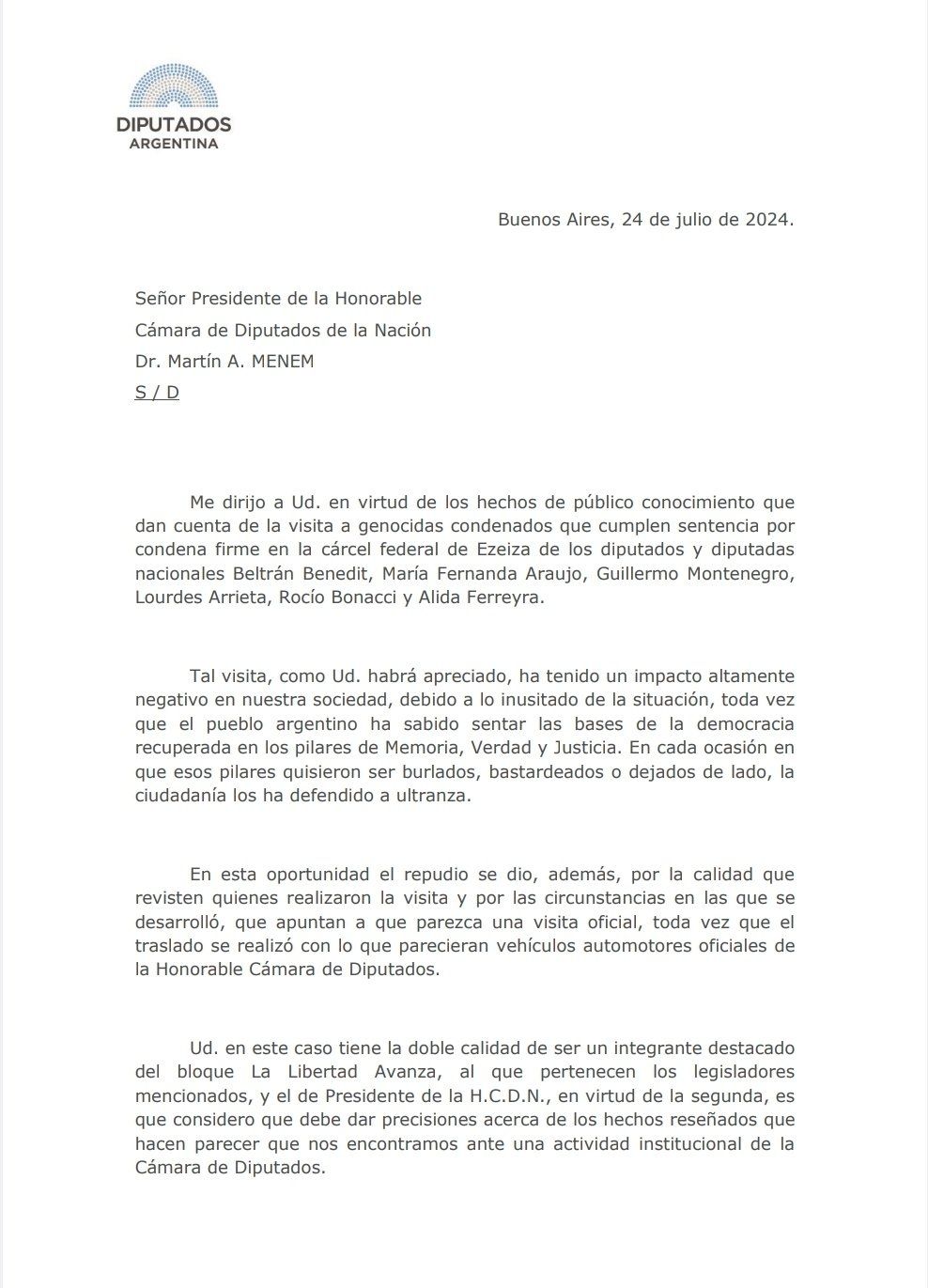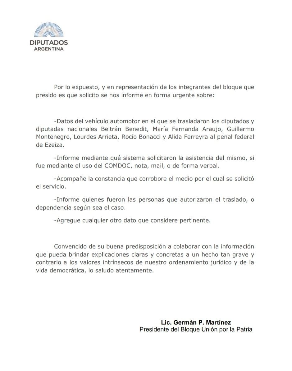 Por estos motivos, el bloque de la oposición solicitó información sobre "el vehículo automotor en el que se trasladaron los diputados nacionales Beltrán Benedit, María Fernanda Araujo, Guillermo Montenegro, Lourdes Arrieta, Rocío Bonacci y Alida Ferreyra al penal federal de Ezeiza".