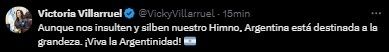 En su cuenta de X, Villarruel se refirió a los silbidos que recibió el himno argentino sumado a la invasión de hinchas a la cancha y las agresiones a los futbolistas argentinos con botellazos.