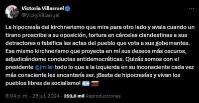 "La hipocresía del kirchnerismo que mira para otro lado y avala cuando un tirano proscribe a su oposición, tortura en cárceles clandestinas a sus detractores o falsifica las actas del pueblo que vota a sus gobernantes", lanzó la titular del Senado a través de la red social X.