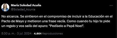 "No alcanza", sostuvo en la red social X donde criticó el enfoque que le otorgó el Poder Ejecutivo a la problemática de la educación dentro del texto que firmarán exmandatarios, gobernadores y referentes políticos.