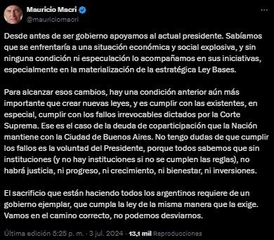 En la red social X, el exmandatario aclaró que "desde antes de ser gobierno apoyamos al actual presidente", pero le recordó a Javier Milei que todavía hay un fallo de la Corte Suprema a favor del distrito gobernado por Jorge Macri.
