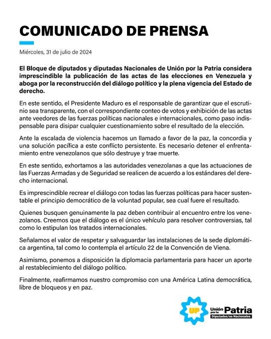 De a poco, el kirchnerismo va rompiendo el silencio ante la crisis institucional en Venezuela luego de las accidentadas elecciones del domingo pasado. Ahora fue el turno del bloque de Unión por la Patria en la Cámara de Diputados en donde subrayaron en un comunicado la necesidad de que el régimen de Nicolás Maduro publique las actas de los comicios.