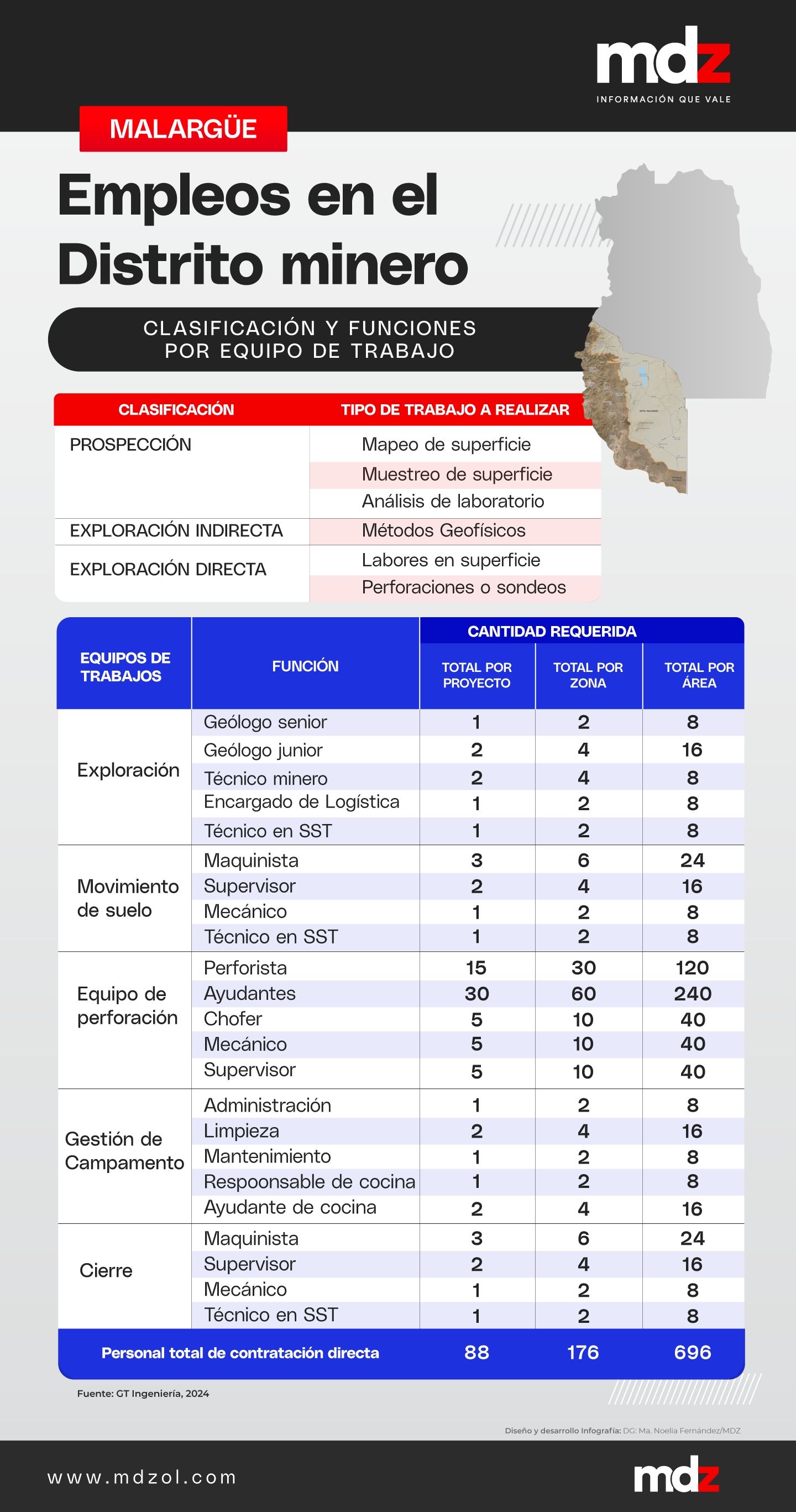 En el Distrito hay nacientes de ríos y más e 600 glaciares, que fueron declarados como zona no apta para el plan de exploración. En cuanto al empleo a generar, se espera que vaya escalando según los resultados. En el proyecto "modelo" que es replicado en todos lso casos, se prevé un pico de 88 personas contratadas de manera directa como máximo (incluyendo la perforación).