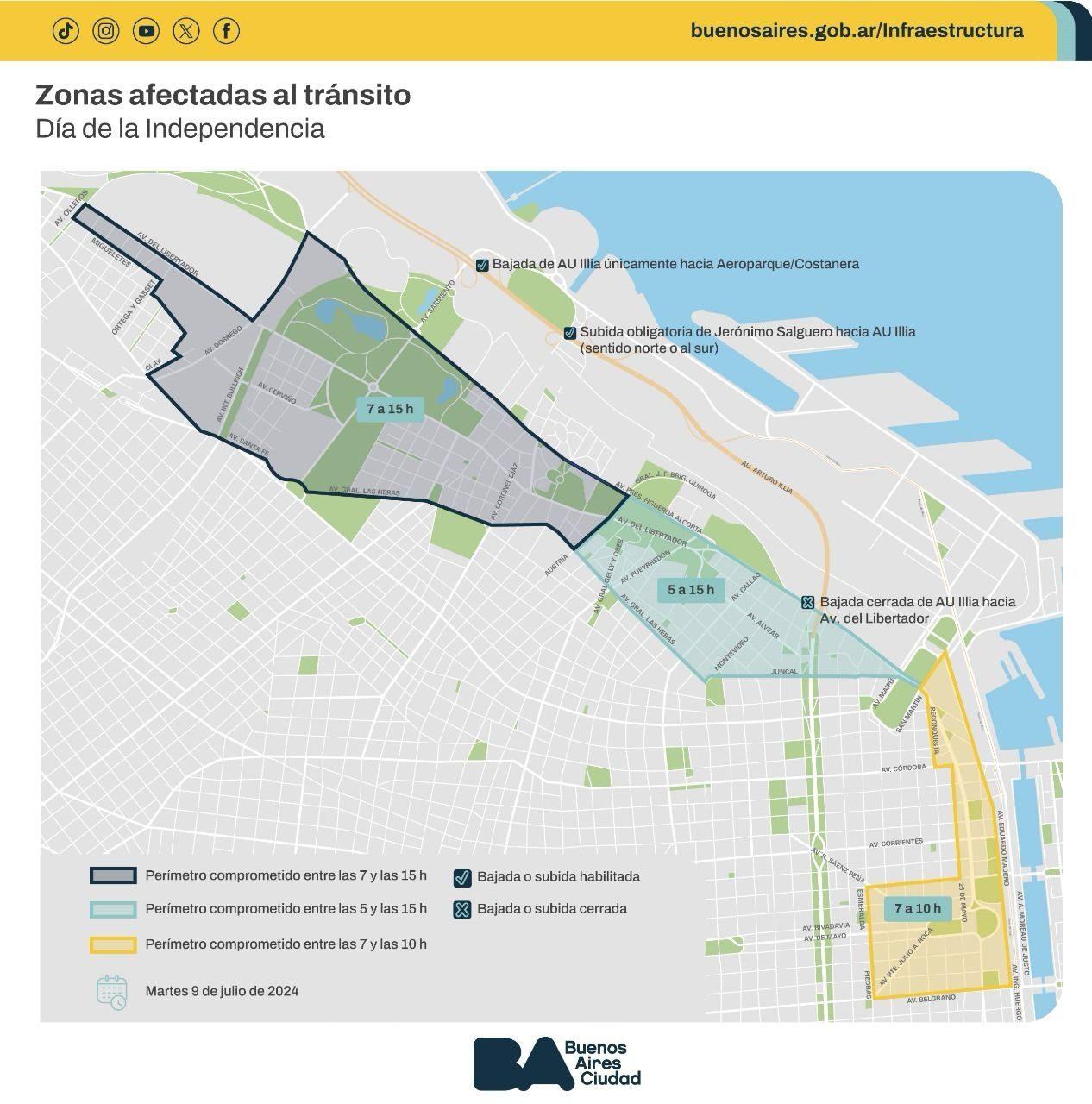 - Bajada AU. Illia hacia Av. Del Libertador. De 5 a 15 horas. Se desvía el tránsito hacia la Av. 9 de julio