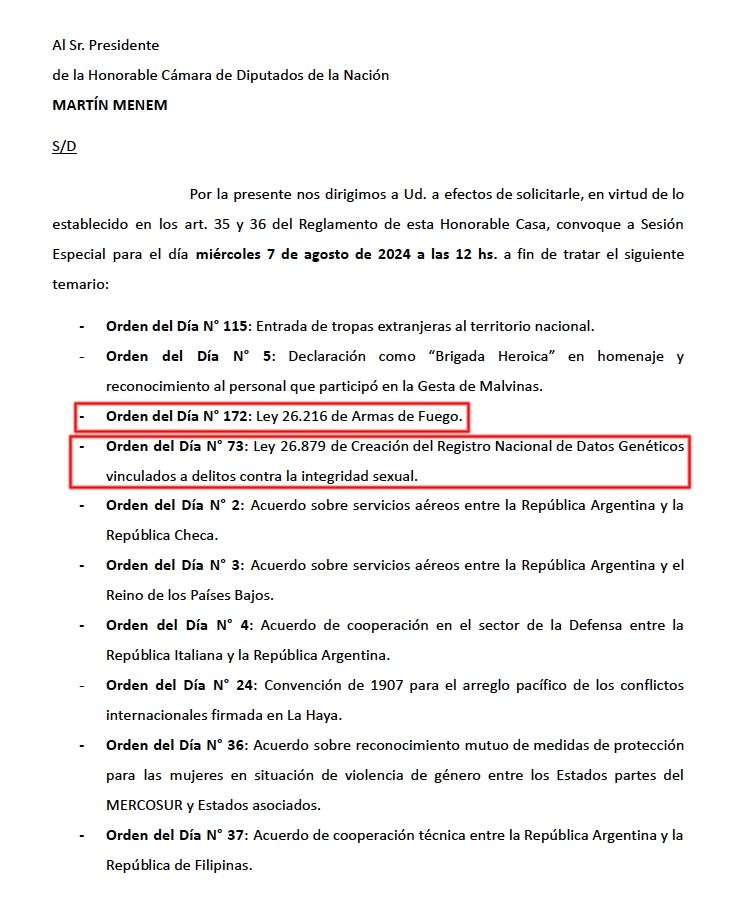 La convocatoria al recinto de la Cámara Baja es para el miércoles 7 de agosto de 2024 a las 12 y cuenta con el apoyo de otros cinco legisladores del PRO.