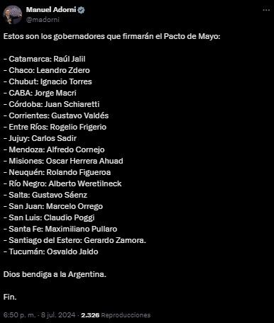 El vocero presidencial Manuel Adorni dio a conocer la lista de los gobernadores que viajarán a Tucumán para acompañar a Javier Milei en la firma del Pacto de Mayo.