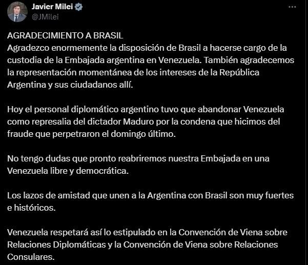 "Agradezco enormemente la disposición de Brasil a hacerse cargo de la custodia de la Embajada argentina en Venezuela. También agradecemos la representación momentánea de los intereses de la República Argentina y sus ciudadanos allí", comenzó el mensaje de agradecimiento de Milei.