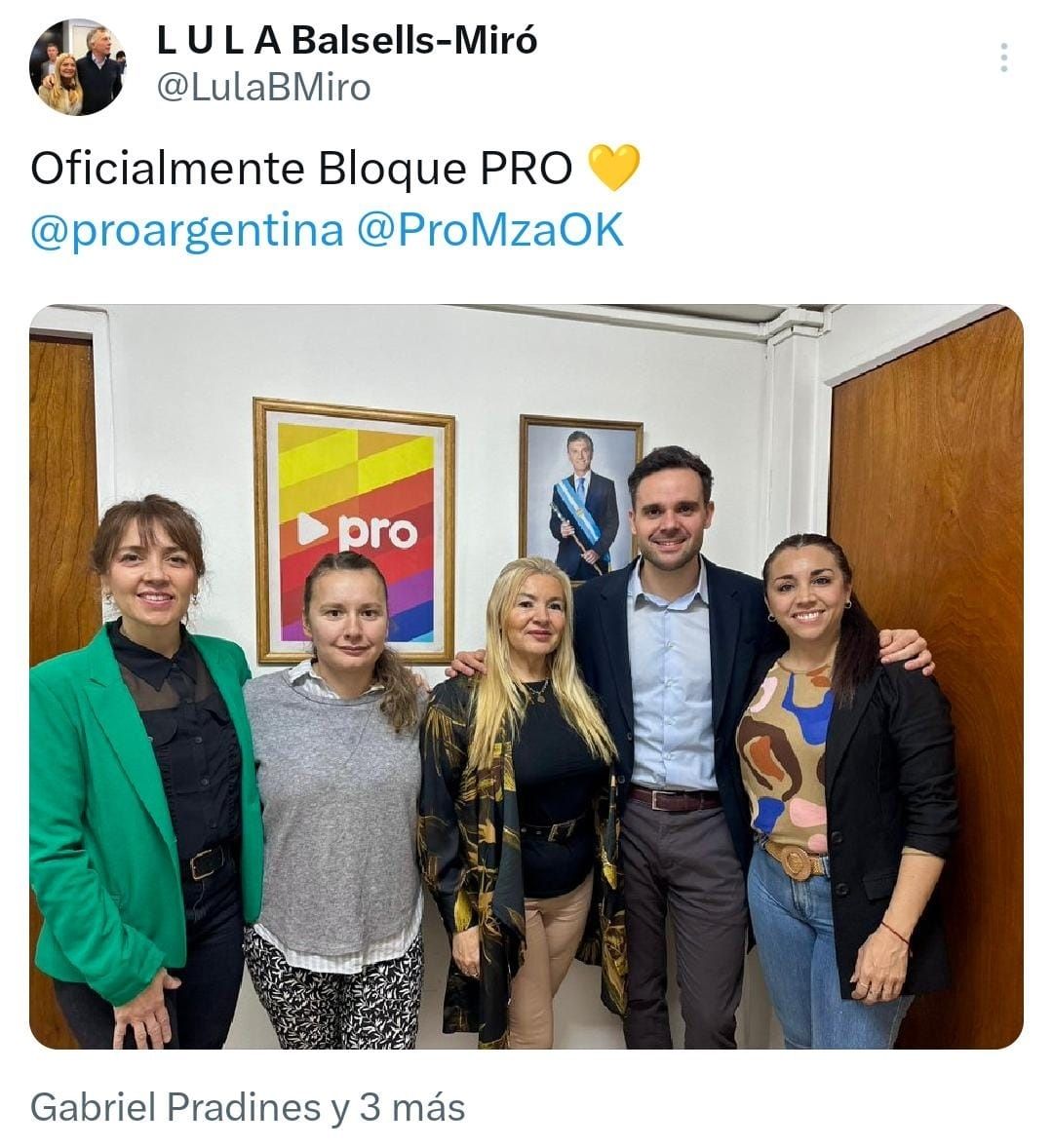 El senador provincial Gabriel Pradines es el nuevo presidente del PRO de Mendoza tras la elección interna del 30 de junio pasado. Como su sector pertenece a La Unión Mendocina y no al oficialista Cambio Mendoza, el bloque de Diputados que le responde se llamará "PRO" y no más Juntos por la Libertad en la Legislatura mendocina. Por lo tanto, los tres diputados del partido que están en Cambia Mendoza no podrán usar el nombre "PRO" como hasta ahora, de acuerdo a lo que planteará Pradines.