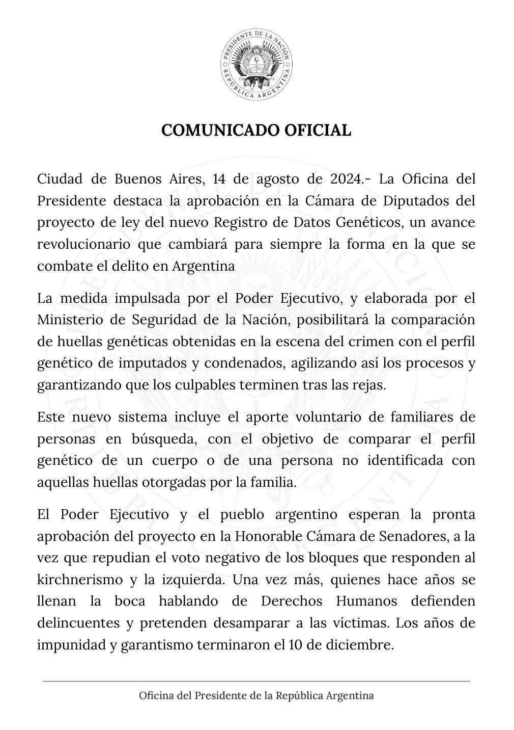 Desde la Oficina del Presidente, Javier Milei destacó la aprobación en la Cámara de Diputados del proyecto de ley del nuevo Registro de Datos Genéticos y volvió a cargar contra el kirchnerismo tras votar en contra de la iniciativa junto con la izquierda.