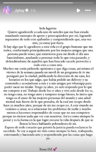 Y agregó: "Si hay algo que le agradezco a esta vida es el grupo humano que me rodea, conformado principalmente por los mejores amigos que una persona puede tener, que estuvieron para mi desde el día uno bancándome, ayudando a procesar todo lo que esta pasando, y defendiéndome de aquellos que han buscado sacarle provecho a todo esto a costa mía".