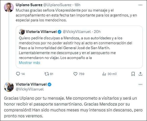 Más tarde, Villarruel le contestó al mandatario mendocino: “Gracias Ulpiano por tu mensaje. Me comprometo a visitarlos y será un honor recibir el pasaporte sanmartiniano. Gracias Mendoza por su comprensión. Han sido muchos meses muy intensos sin descanso, pero pronto nos veremos”.
