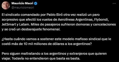 "El sindicato comandado por Pablo Biró otra vez realizó un paro sorpresivo que afectó los vuelos de Aerolíneas Argentinas, Flybondi, JetSmart y Latam. Miles de pasajeros sufrieron demoras y cancelaciones y se creó un desbarajuste fenomenal", afirmó Macri en su mensaje.