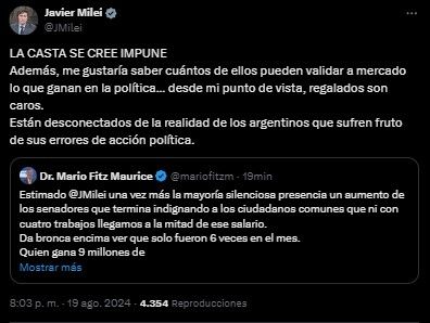 "Están desconectados de la realidad de los argentinos que sufren fruto de sus errores de acción política", completó Milei su publicación. El posteo fue en respuesta a un mensaje que escribió el médico cardiólogo y Jefe de Arritmias del Hospital Rivadavia, Mario Fitz Maurice, quien descargó su "bronca y desilusión" tras el nuevo incremento en la Cámara Alta.