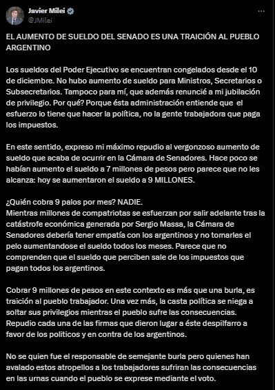 Minutos más tarde, Milei posteó un descargo más extenso que sumó fuertes críticas a los senadores y donde no tuvo reparos en calificar la medida como una "traición al pueblo argentino".