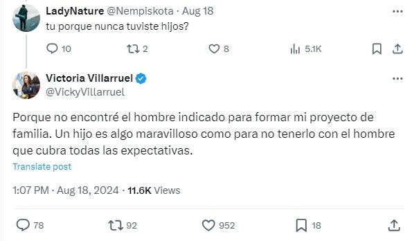 "Tu porque nunca tuviste hijos?", fue el comentario del usuario @Nempiskota. Lejos de sorprenderse y guardar silencio, Victoria Villarruel no se guardó nada y fue contundente con su respuesta.