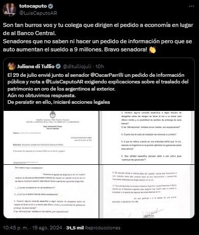 "El 29 de julio envié junto al senador Oscar Parrilli un pedido de información pública y nota a Luis Caputo exigiendo explicaciones sobre el traslado del patrimonio en oro de los argentinos al exterior. Aún no obtuvimos respuesta. De persistir en ello, iniciaré acciones legales", remarcó con su mensaje en X.