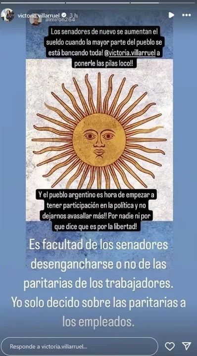 “Los senadores de nuevo se aumentan el sueldo cuando la mayor parte del pueblo se está bancando toda! Victoria Villarruel ponete las pilas, loco. Y el pueblo argentino es hora de empezar a tener participación en la política y no dejarnos avasallar más! Por nadie ni por que dice que es por la libertad”, cuestionó el usuario de Instagram @Almiron264, quien recibió la rápida respuesta de Villarruel.