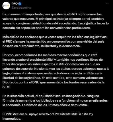En esa línea, señalaron que "ninguna fórmula de aumento a los jubilados va a funcionar si no se arregla antes la economía". "La historia de los últimos años lo demuestra. El PRO declara su apoyo al veto del Presidente Milei a esta ley inapropiada", concluyeron.