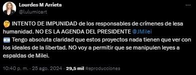 "INTENTO DE IMPUNIDAD de los responsables de crímenes de lesa humanidad. NO ES LA AGENDA DEL PRESIDENTE Milei", escribió Arrieta, quien aseguró que dichos proyectos "nada tienen que ver con los ideales de la libertad". "NO voy a permitir que se manipulen leyes a espaldas de Milei", subrayó.