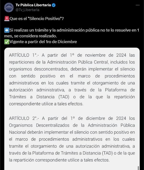 En el primer articulo de la Decisión Administrativa se establece que "a partir del 1º de noviembre de 2024 las reparticiones de la Administración Pública Central, incluidos los organismos desconcentrados, deberán implementar el silencio con sentido positivo en el marco de procedimientos administrativos en los cuales tramite el otorgamiento de una autorización administrativa, a través de la Plataforma de Trámites a Distancia (TAD) o de la que la repartición correspondiente utilice a tales efectos".