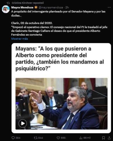 El enfrentamiento entre Cristina Fernández de Kirchner y el senador de Unión por la Patria José Mayans continúa y ambos siguen lanzándose cuestionamientos entre sí.