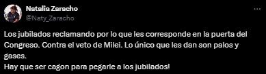 En tanto, Natalia Zaracho (Unión por la Patria) defendió a los jubilados por reclamar "por lo que les corresponde en la puerta del Congreso” en contra del veto de Milei. "Lo único que les dan son palos y gases. ¡Hay que ser cagón para pegarle a los jubilados!", escribió en X la diputada de origen cartonera, cercana a Juan Grabois.