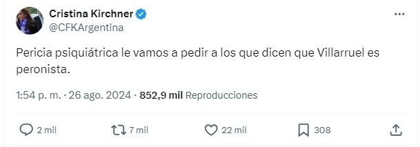 En ese sentido, esta semana el kirchnerismo quedó envuelto en una discusión insólita. Agitando fantasmas destituyentes, hubo dirigentes como José Mayans, jefe del bloque de senadores, que hablaron de un eventual juicio político a Milei y destacaron que Victoria Villarruel tenía cosas más peronistas que él. También se expresaron en términos similares Guillermo Moreno y Sergio Berni. Cristina Kirchner los mandó a realizarse “pericias psiquiátricas”.