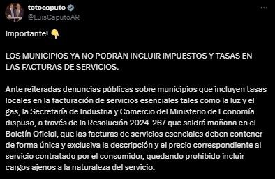 "Ante reiteradas denuncias públicas sobre municipios que incluyen tasas locales en la facturación de servicios esenciales tales como la luz y el gas, la Secretaría de Industria y Comercio del Ministerio de Economía dispuso, a través de la Resolución 2024-267 que saldrá mañana en el Boletín Oficial, que las facturas de servicios esenciales deben contener de forma única y exclusiva la descripción y el precio correspondiente al servicio contratado por el consumidor, quedando prohibido incluir cargos ajenos a la naturaleza del servicio", anunció el funcionario en un mensaje en su cuenta de X.
