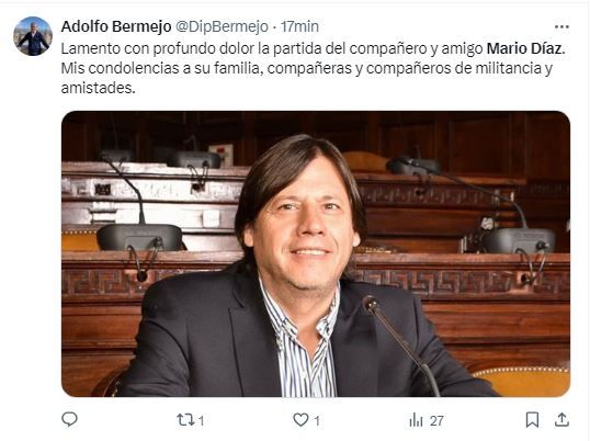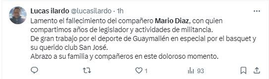 "Nos dejó un gran amigo, un gran dirigente social, un gran compañero, descansa en Paz querido Mario", manifestó en las redes sociales el diputado nacional Martín Aveiro al conocer la noticia del deceso de su correligionario. Otros dirigentes como Adolfo Bermejo y Lucas lardo también expresaron su dolor.