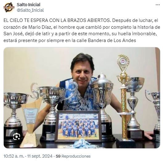 "El cielo te espera con los brazos abiertos. Después de luchar, el corazón de Mario Díaz, el hombre que cambió por completo la historia de San José, dejó de latir y a partir de este momento, su huella imborrable, estará presente por siempre en la calle Bandera de Los Andes", destacan desde la cuenta "Salto Inicial", dedicada al básquet mendocino.