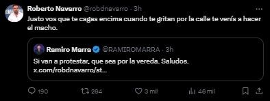 Marra se hizo eco de los comentarios de Navarro en contra del protocolo antipiquetes y lo desafió: "Si van a protestar, que sea por la vereda. Saludos".