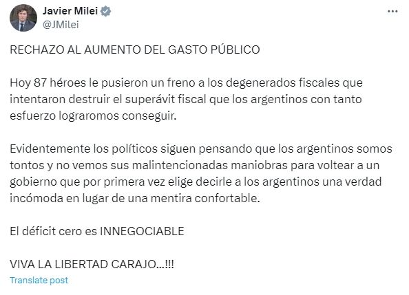 "El déficit cero es INNEGOCIABLE. VIVA LA LIBERTAD CARAJO...!!!", finalizó.