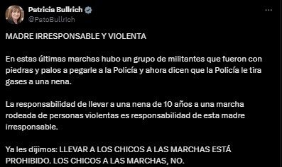 "En estas últimas marchas hubo un grupo de militantes que fueron con piedras y palos a pegarle a la Policía y ahora dicen que la Policía le tira gases a una nena. La responsabilidad de llevar a una nena de 10 años a una marcha rodeada de personas violentas es responsabilidad de esta madre irresponsable", sostuvo la funcionaria en una publicación en su cuenta de red social X.