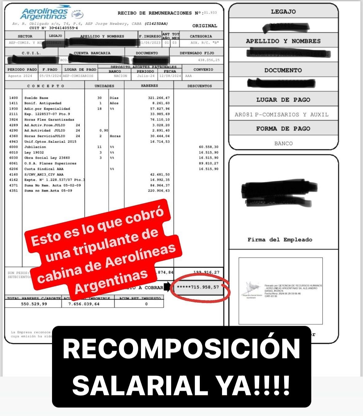 A esto se le sumó el fuerte comunicado de la Asociación Argentina de Aeronavegantes, el gremio liderado por Juan Pablo Brey, que compartió recibos de empleados de Aerolíneas con un año de antigüedad para reclamar por una recomposición salarial.