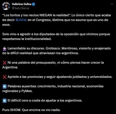 En ese marco, este lunes se viralizó un video en redes sociales donde se ve a la diputada de Unión por la Patria, Sabrina Selva, respondiendo al mandatario con un fuck you desde su banca.