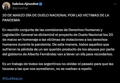 La diputada del PRO y presidenta de la Comisión de Derechos Humanos de la Cámara Baja, Sabrina Ajmechet, impulsa la iniciativa que también propone que en esa fecha (cuando se decretó el Aislamiento Social, Preventivo y Obligatorio en la Argentina), la Bandera Nacional permanezca a media asta en los edificios y lugares públicos.