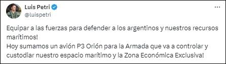 El ministro de Defensa, Luis Petri, celebró la llegada del P3 Orion: “Equipar a las fuerzas para defender a los argentinos y nuestros recursos marítimos”.